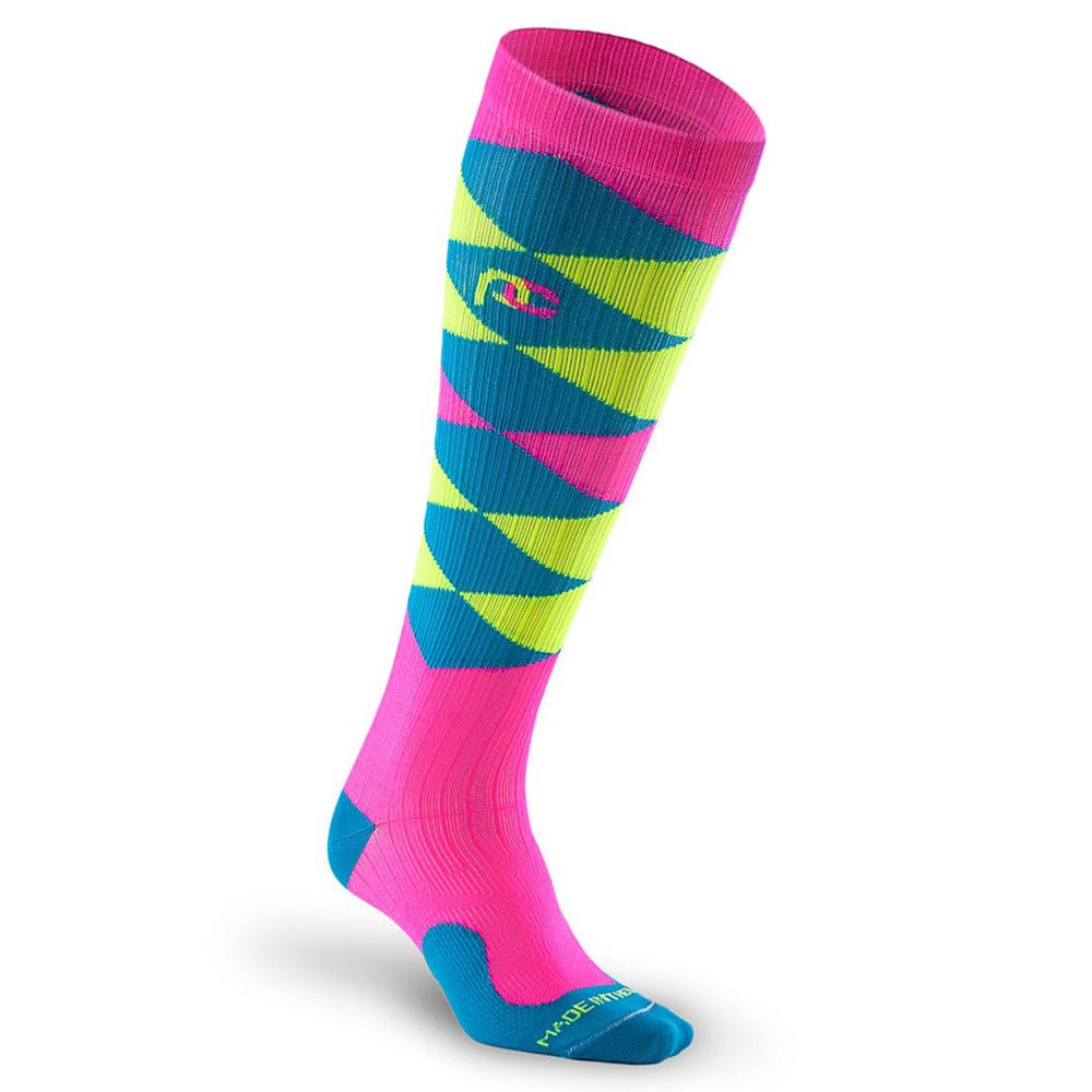 These ever-popular compression socks are guaranteed to make you stand out in the crowd, combining classic argyle styling with neon yellow, hot pink, and aqua/teal colors.