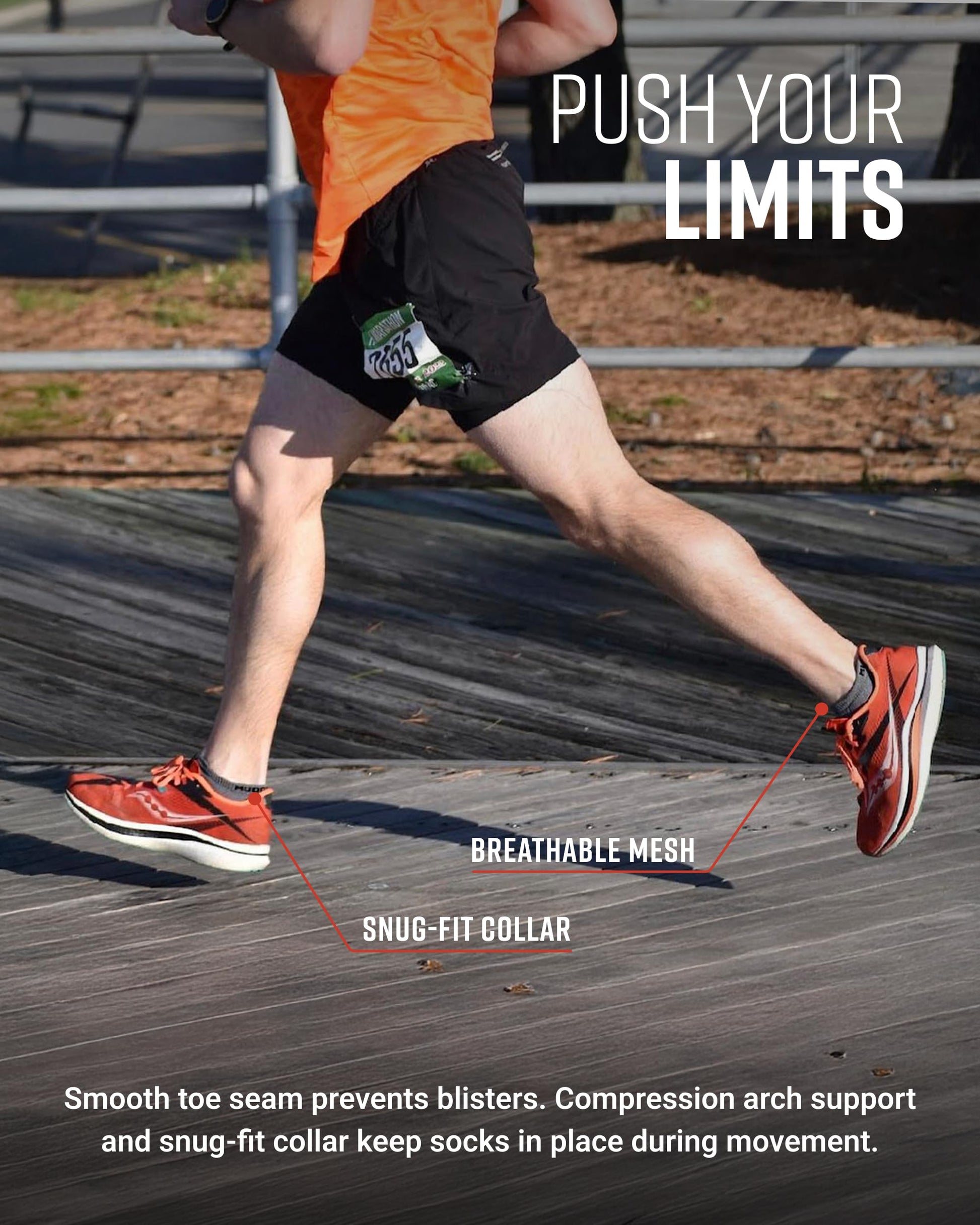 Midfoot compression hugs the arch and keeps our noshow running socks in place, so they won't sag and bunch in the bottom of your shoes. Light cushioning and a seamless toe prevent hot spots that cause blisters.