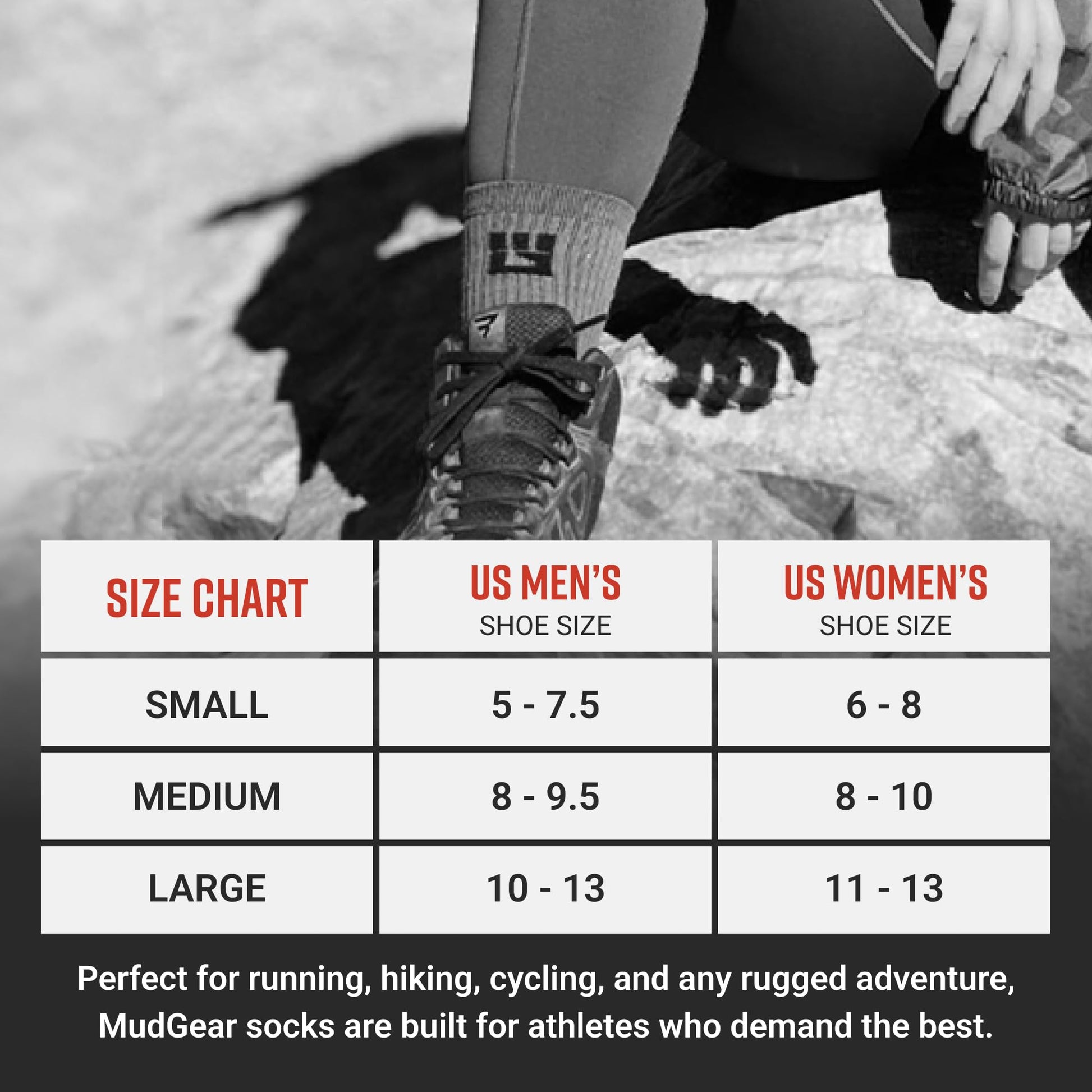 You can settle for any old socks if you’re carefully walking less than a mile on cushioned flat land in perfect weather; but that’s not why you’re here. Is it? You know that MudGear never builds socks that are only perfect in perfect conditions. MudGear Hiking / Trekking Socks are designed to provide premium arch and ankle support for off-road (maybe off-trail) terrain over regularly ascending / descending elevation. Our moisture-wicking blend of premium poly-spandex yarns is strategically placed to prevent hot spots and blisters. These socks don’t retain water, and they drain quickly after trekking through puddles and creek beds. The end result is sheer comfort that makes getting there MORE than “half the fun.”