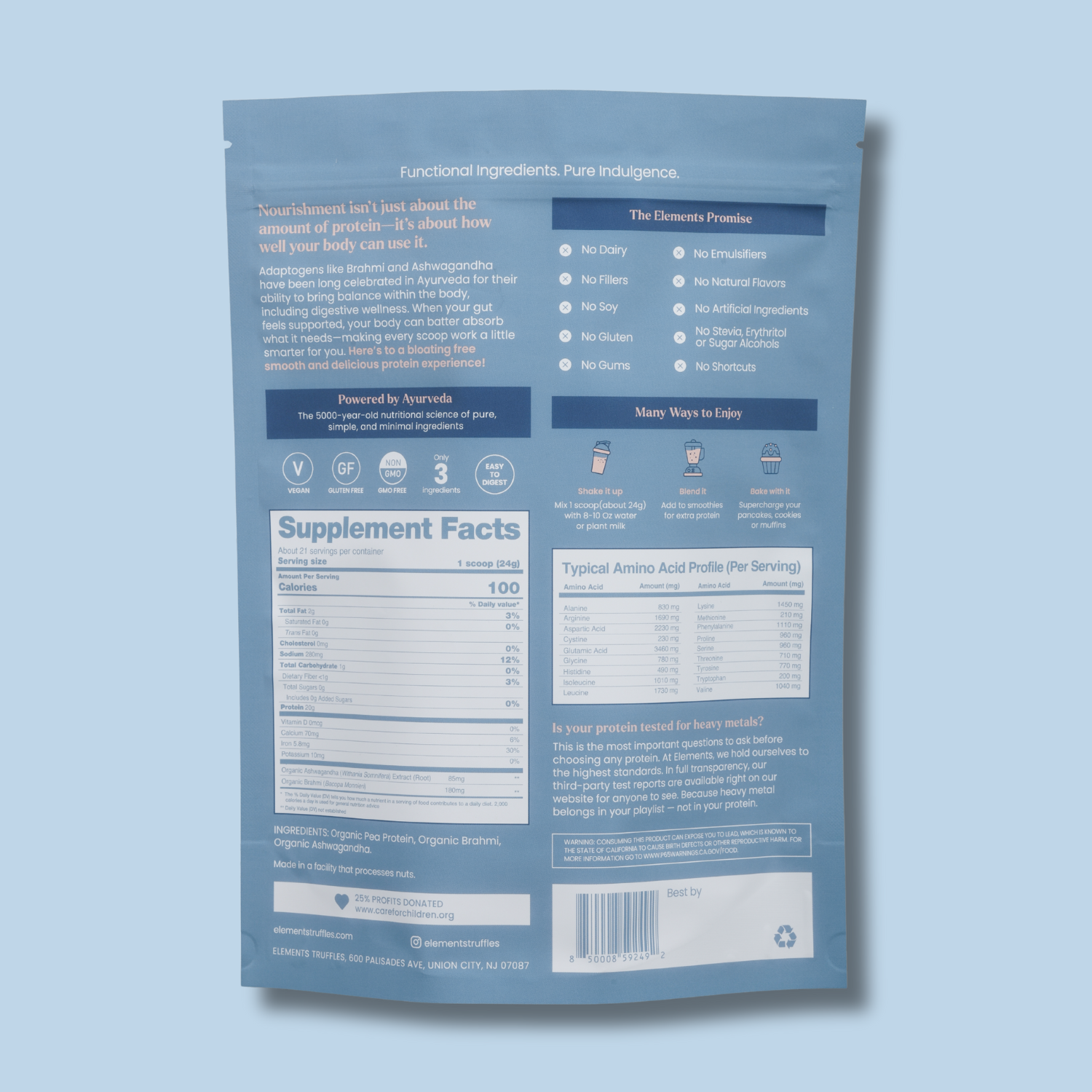 Organic Pea Protein Isolate, Organic Ashwagandha Root Powder, Organic Brahmi Powder.
